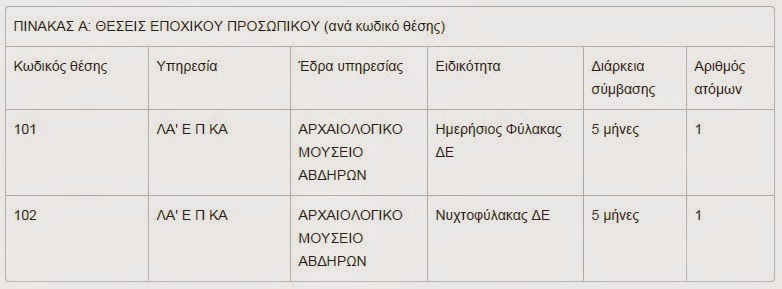 Ανακοίνωση για την πρόσληψη, με σύμβαση εργασίας ιδιωτικού δικαίου ορισμένου χρόνου, συνολικά δύο (2) ατόμων για την κάλυψη εποχικών ή παροδικών αναγκών της ΛΑ' Εφορείας Προϊστορικών και Κλασικών Αρχαιοτήτων, που εδρεύει στο Αρχαιολογικό Μουσείο Αβδήρων της Π.Ε. Ξάνθης, και συγκεκριμένα του εξής, ανά υπηρεσία, έδρα, ειδικότητα και διάρκεια σύμβασης, αριθμού ατόμων (βλ. ΠΙΝΑΚΑ Α), με τα αντίστοιχα απαιτούμενα (τυπικά και τυχόν πρόσθετα) προσόντα:
