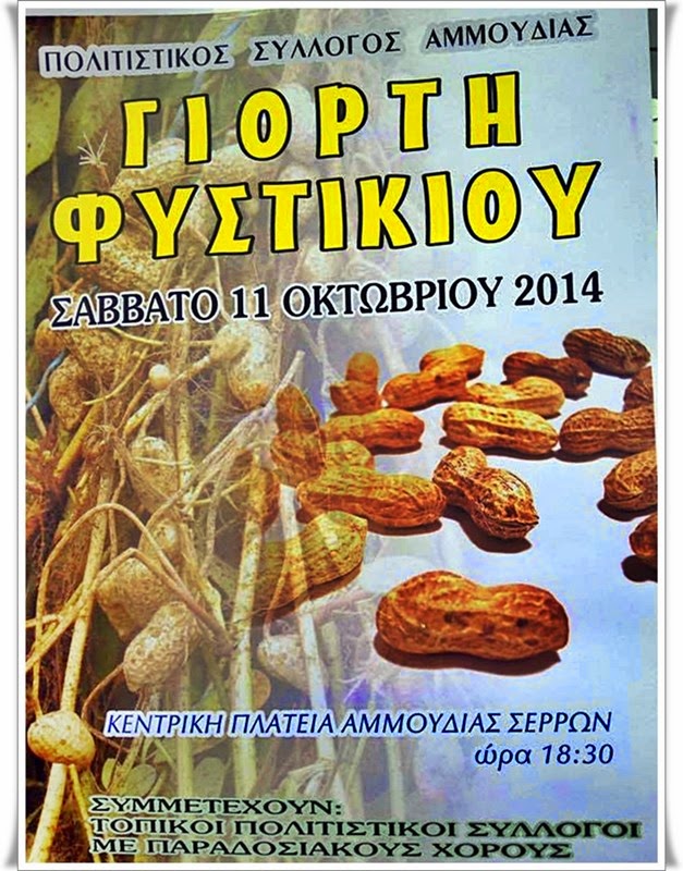 Όπως κάθε χρόνο έτσι και φέτος το Σάββατο, 11 Οκτωβρίου 2014 και ώρα 06.30 μ.μ. στην κεντρική πλατεία της Αμμουδιάς θα πραγματοποιηθεί η 3η γιορτή φυστικιού που διοργανώνει ο Πολιτιστικός Σύλλογο της Τοπικής Κοινότητας Αμμουδιάς με την Κοινωφελή Επιχείρησης του Δήμου Ηράκλειας, σε συνεργασία με το Επιμελητήριο Σερρών.