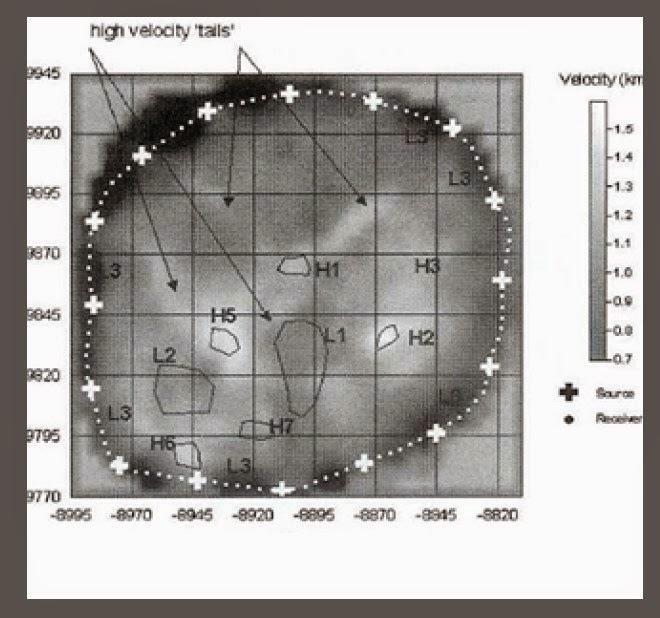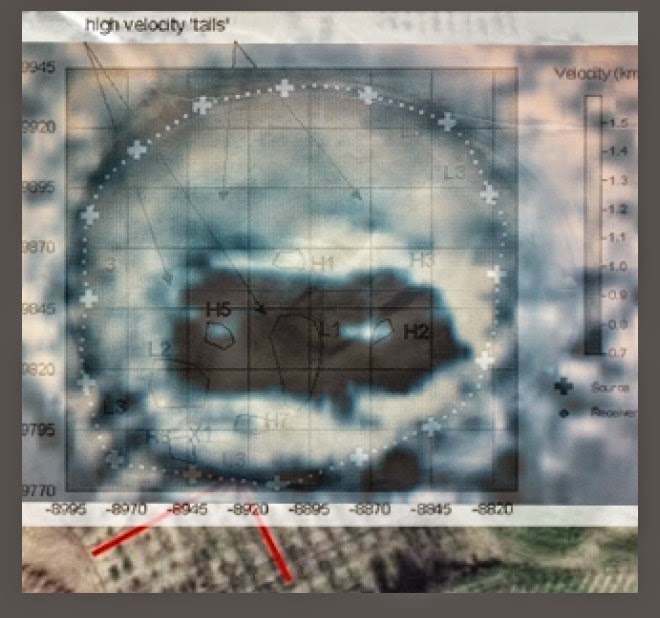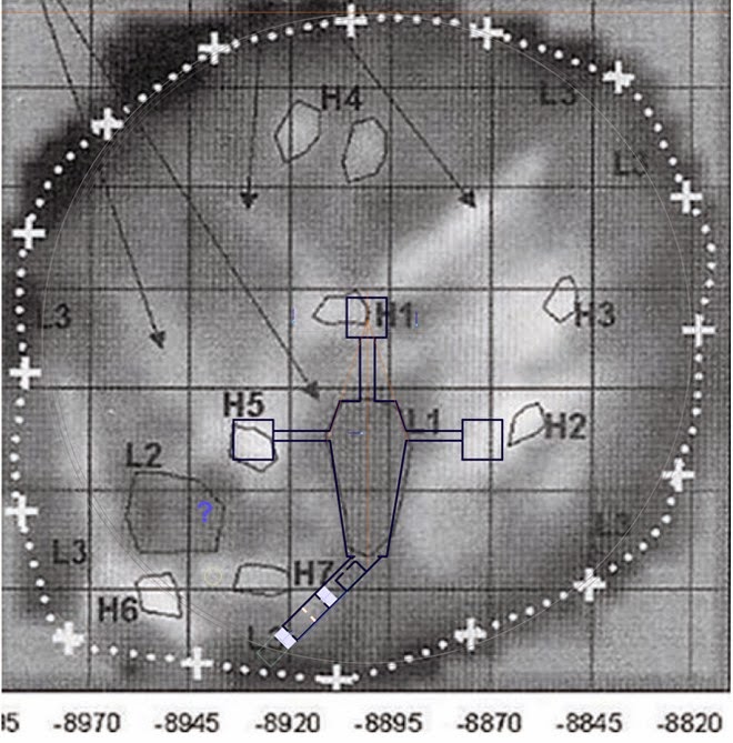 Εδώ παρατήρησα κάτι κοινό. Ότι οι περιοχές από την μελέτη Πολυμενάκου Η5 και Η2 συμπίπτουν με τα δύο φωτεινά τετράγωνα που διακρίνονται μέσα στη μεγάλη σκιά που υποτίθεται ότι οριοθετεί στο περίπου την περιοχή των ενδεχόμενων κτισμάτων,στη «μελέτη Παππαθεοδώρου».